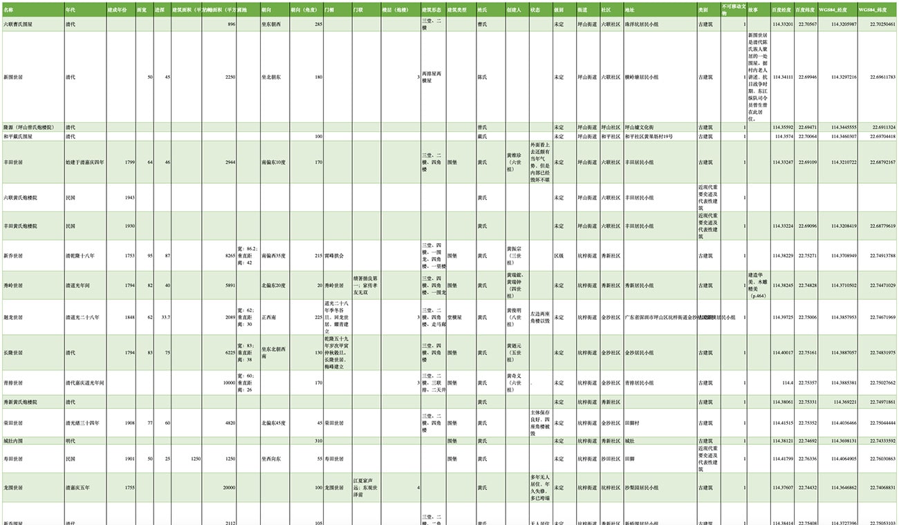 ( 手工整理、补全的坪山客家围屋数据表 ) - 现场拍摄