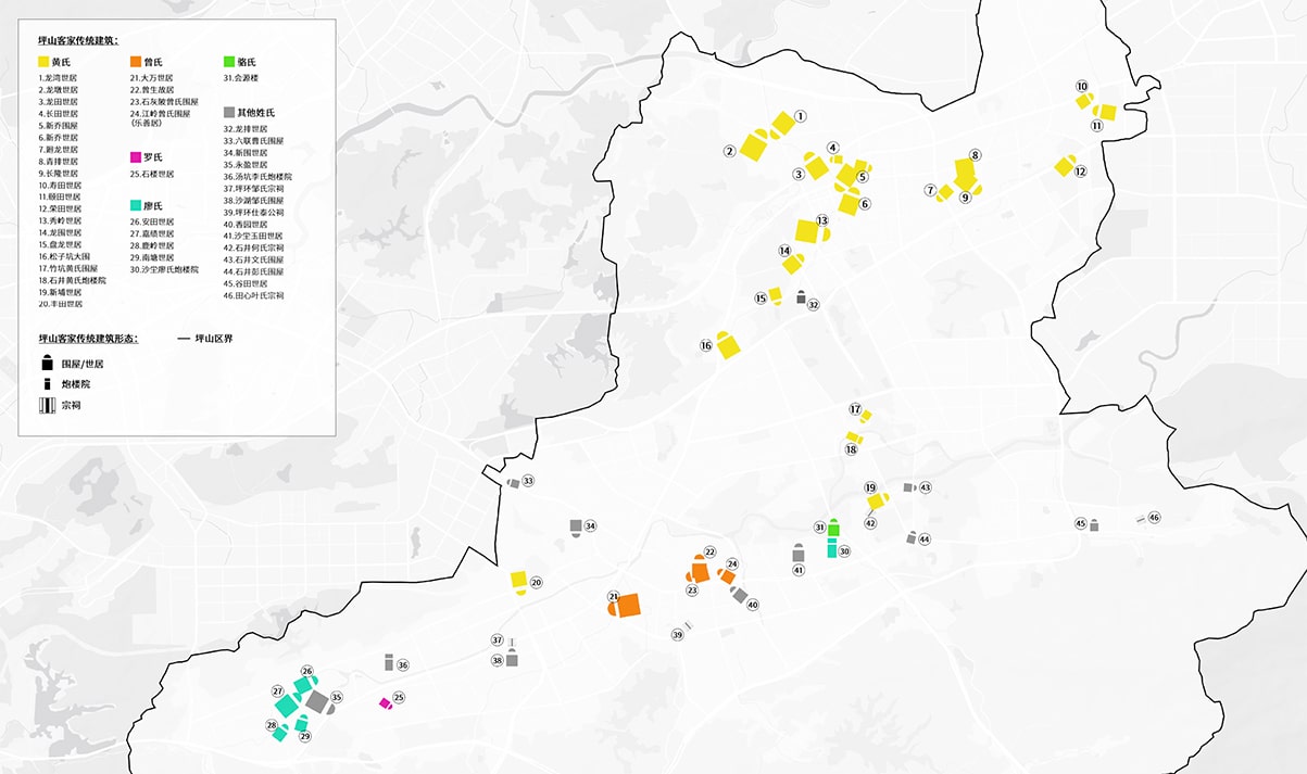 ( 坪山客家围屋和世居的分布 )