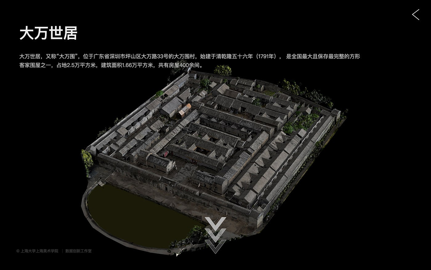 为了让无法亲自前往世居的用户也能体会围屋的完整、宏大的建筑结构,我们将扫描的世居三维模型部署到了基于web的平台上,并且通过标注的形式提供了更多信息,这种形式即可以让观众了解建筑原貌,也可以体会围屋当年生活居住在其中的人背后的故事。