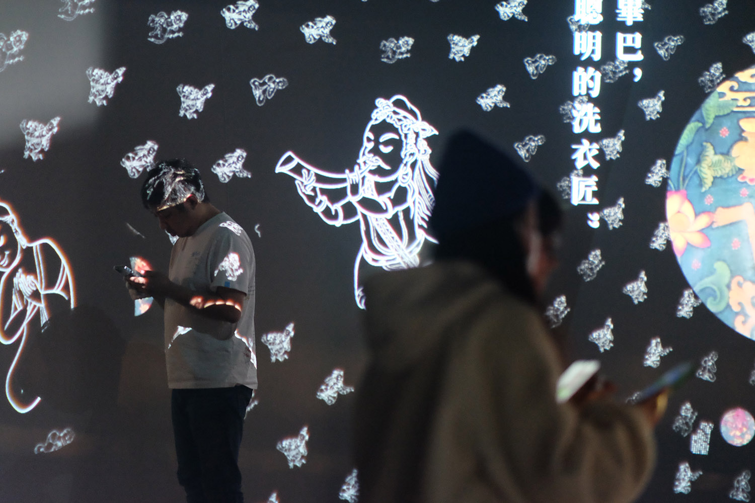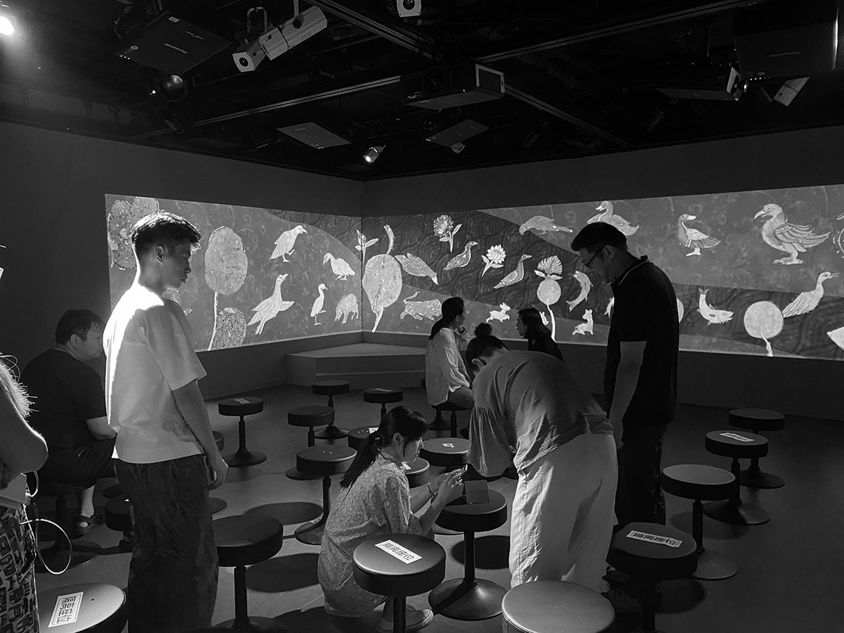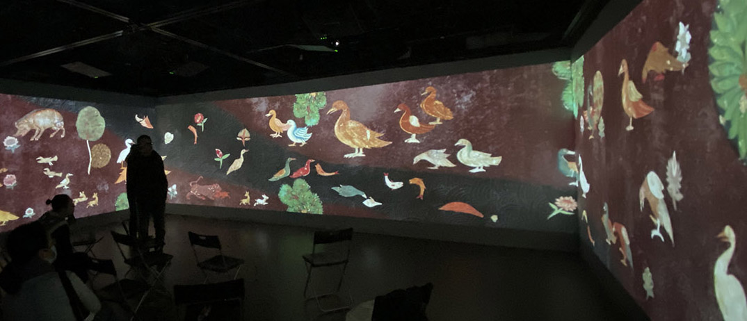 《灵鸟之森》通过参考夏鲁寺壁画中的原始元素、构图方式、上色风格等,在画面上作了取舍与重构,以动画效果赋予壁画灵动姿态,将原壁画中的生动之处以更丰富的形态呈现给观众。