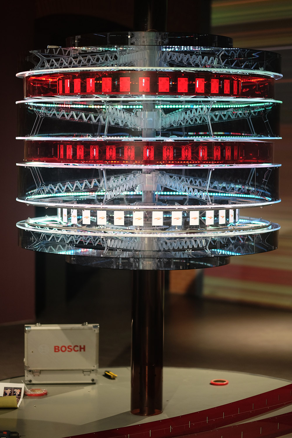 这是一件开放式的交互装置作品,它允许触摸和转动。形、音、色三者在转动中合而神聚,散宇宙无有不奇,旋转更是奇中之玄。也许观众从《藏轮》的外观特征上很容易直接联想到转经筒,然而存在于宇宙和我们身体中的无始无终的旋转才是这件作品在形式上的立身之本。2021年11月19日,《藏轮》并没有完成,也无法完成,它在它的旋转中继续。