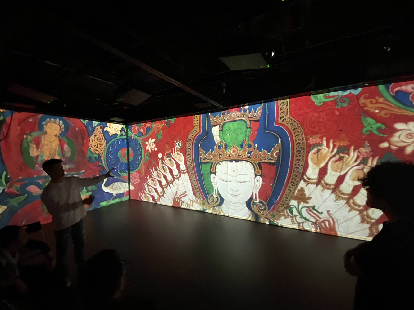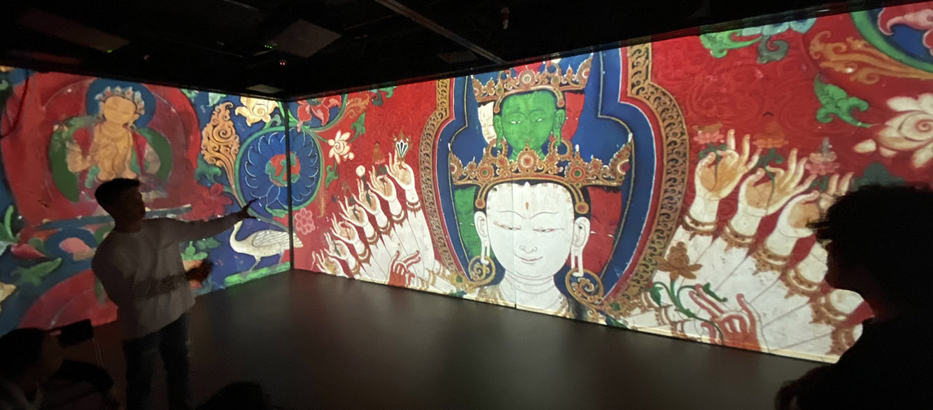 白居寺壁画艺术是结合了寺庙空间、光影、声音以及氛围的多维度艺术。借助多媒体技术,在方寸之间带领观赏者从不同层面感受白居寺壁画的艺术丰富性。解构颜色,观其真彩。叠以光影,观佛姿态。神游其中,恍如隔世。